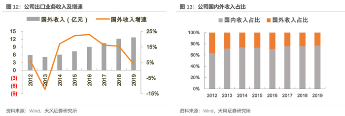 加快国际化发展,海内外新客户持续拓展。(1)收购海外公司:2016年收购美国热动力公司、2019年收购瑞典Setrab AB 公司,目前已基本形成中国、北美、欧洲三个战略发展支点。(2)拓展海外客户:在原有优质国内客户基础上,公司近年又开拓德国大众、英国捷豹路虎、德国曼胡默尔等海外新客户,2019年公司海外收入达12.7亿元,同比增长4.2%,海外收入占比23%;未来随配套订单逐步落地,海外收入规模及占比有望进一步提升。