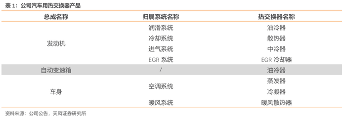 公司换热产品种类齐全,可生产大多数汽车用热交换器。热交换器是用来使热量加速从热流体传递到冷流体的一种设备,在汽车和工程机械车辆上应用广泛。汽车上的热交换产品包括散热器、中冷器、机油冷却器、空调冷凝器和蒸发器、暖风散热器、尾气再循环系统冷却器、液压油冷却器等,主要分布在发动机、变速箱、车身三大系统上。公司热交换产品储备丰富,目前已拥有油冷器、冷却模块、EGR冷却器、SCR系统及铝压铸件等五大系列产品,共3000多个品种规格。