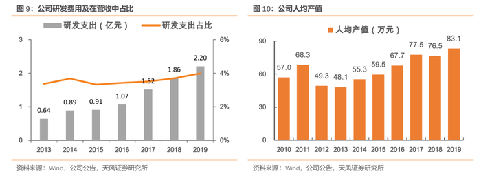 重视研发投入,人均产值逐年增长。(1)重视研发投入:公司拥有天台研究总院、杭州研究分院、上海研究分院、北美研究分院,正集中海内外资源重点投入新能源汽车热管理系统、传统乘用车节能降耗产品、商用车和工程机械冷却模块系统等产品的研发。2019年公司研发支出达2.2亿元,同比增长18.4%,占营业收入比重提升至4%;研发人员达到1150名,在总员工中占比达17.3%。(2)提升生产效率:公司构建内部三大平台(质量管理、项目管理、创新管理)及三大系统(技术研发、市场营销、供应商管理),并成立了专门的智能装备公司等三大支持保障平台,打造精益生产模式,推进智能制造,生产效率不断提升,2019年人均产值达到83.1万元,同比增长8.7%。