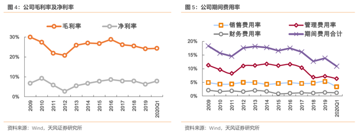 2020年开年的新冠肺炎疫情对国内外汽车产业产生较大负面冲击,20Q1国内汽车产量同比降幅达45.2%,但受益于新客户的持续开拓、成本管控能力的提升以及新能源汽车热管理等业务的快速成长,公司20Q1收入及归母净利润同比仅下滑8.2%和14.7%,毛利率、净利率环比19Q4提高0.05和3.5个百分点,三费率同比和环比分别减少1.6和4.6个百分点,疫情之下凸显较强的抗压能力。