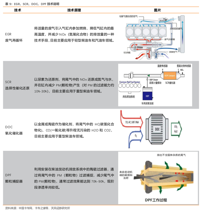 常用的四大尾气处理技术:EGR、SCR、DOC、DPF,侧重点各有不同。EGR即废气再循环系统,主要用于降低气体中的NOx;SCR为选择性催化还原技术,主要用于去除尾气中的NOx并降低PM;DOC为氧化催化器,主要用于去除尾气中的HC和CO;DPF为颗粒捕捉器,可用于大幅降低尾气中的PM。