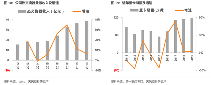 受益重卡高景气,2016年以来热交换业务收入保持较快增长。公司热交换业务中,来自商用车的收入占比预计约50%(主要配套中重卡),因此公司热交换业务收入表现与重卡景气度关联较大。2016年下半年开始,在超限超载治理政策的催化下,重卡需求量迅速扩大,2017至2019年重卡年销量连续三年突破100万辆,且逐年创下新高,带动公司热交换业务收入持续增长,2019年收入38.9亿元,2015年至2019年复合增速达19.2%。