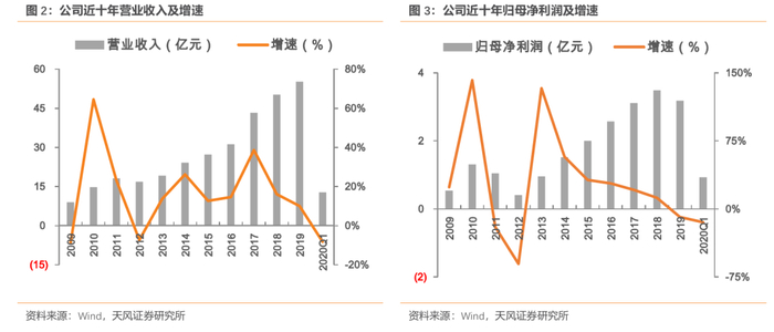 近十年业绩保持稳健增长,疫情之下凸显较强抗压能力。回顾公司过去十年(2009年~2019年)业绩表现,尽管在2011年和2012年两年净利润出现了负增长(主要是由于当时公司客户结构尚以商用车为主,受商用车景气度下滑影响),但十年间公司整体业绩仍实现了较大幅度且稳定的增长:营收从9.0亿元增长至55.2亿元,净利润从0.54亿元增长至3.2亿元,年均复合增速分别为19.9%和19.4%。
