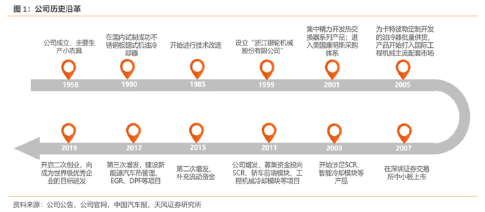 深耕热交换器领域四十年,客户结构优质。公司前身为创建于1958年的国营天台机械厂,1999年改制成为股份有限公司,2007年在深圳证券交易所上市。成立之初,公司主要生产农业机械零部件,1980年成功试制不锈钢板翅式油冷器,进入换热器领域。经过四十余年专注与创新,公司已成长为国内产量最大的发动机、汽车、工程机械等领域的换热器制造商之一,客户涵盖宝马、戴姆勒、奥迪、法拉利、通用、福特、日产、康明斯、卡特彼勒、沃尔沃等全球知名车企及发动机厂商,以及吉利、广汽、长城、长安、上汽、一汽、重汽等国内龙头车企。