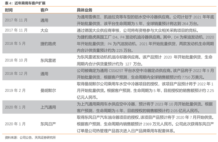 从商用车及工程机械配件切入市场空间更大的乘用车领域。据中汽协数据,2019年国内商用车销量432万辆,而乘用车销量达2144万辆(约为商用车销量的五倍)。近年来,公司战略性地从重卡和工程机械零件商切入市场更大的乘用车配件领域。目前已开发并量产了乘用车热管理相关的机油冷却器及总成、机油滤清器及总成、EGR(废气再循环)冷却器及总成、阀、中冷器、水箱、铝铸件、前端冷却模块等产品,配套福特、长城、上汽、通用等国内外优质乘用车企业。