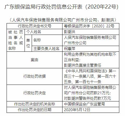 中国经济网北京5月21日讯 今日,中国银保监会网站公布的广东银保监局行政处罚信息公开表(粤银保监罚决字〔2020〕22号)显示,人保汽车保险销售服务有限公司(简称“人保车险”)广州市分公司利用业务便利为其他机构牟取不正当利益,彭潮洪负直接主管责任。