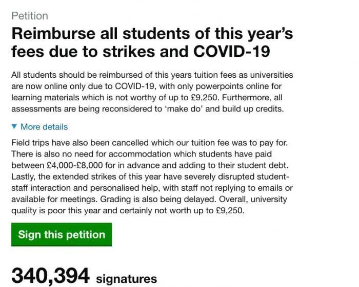 由于疫情迫使很多英国学校关闭,学生无法使用图书馆等设施,课程也都改成网课,留学生认为自己支付的高昂学费“打水漂”了,因此在英国议会网站发起联名请愿,要求英国大学退还2019/2020学年的整年学费和住宿费,目前已有超过34万名学生加入了该请愿。