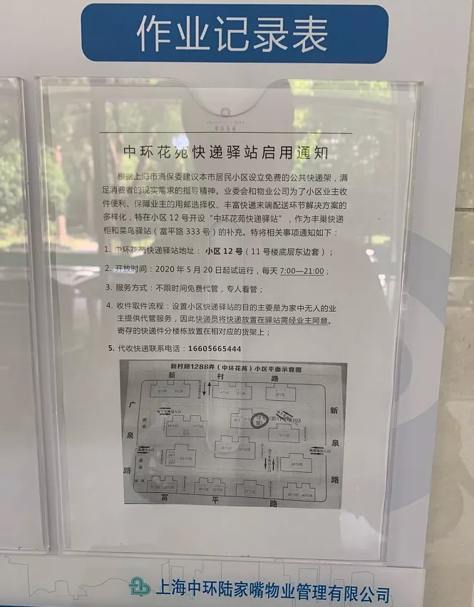 作为上海首个停用丰巢快递柜的小区,中环花苑小区微信公众号于5月19日发布《中环花苑自建快递驿站启用的通知》。通知称,根据上海市消保委建议本市居民小区设立免费的公共快递架,满足消费者的现实需求的指导精神,业委会和物业公司决定在小区12号楼开设“中环花苑快递驿站”。自建快递驿站开放时间为每天7:00-21:00,自5月20日起试运行,由专人负责看管。