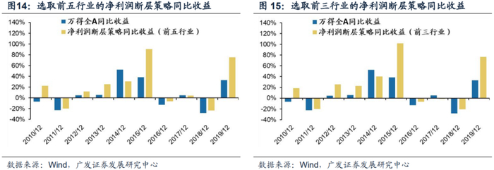 ●个股净利润断层对行业配置有指示作用吗?09年至19年中大多数年份对行业配置指导意义都较大。09年至10年通过净利润断层策略可筛选出采掘、建材、家电、汽车、电子;11年至12年,可选出食品饮料和银行;13年至14年可选出通信、电气设备、医药;15年可选出休闲服务和房地产;16年可选出建材和钢铁;17年可选出家电和食品饮料;19年可筛选出通信、电子、食品饮料等。