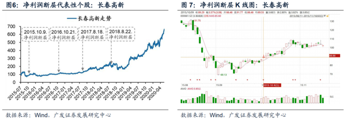 长春高新:本轮上涨周期中长春高新在2015年10月9日发布三季度业绩预告时首次出现净利润断层,当日跳空上涨3.57%。此后,长春高新在2016年4月7日发布2016年一季度业绩预告,在2016年10月21日发布2016年三季报,在2017年4月25日发布2017年一季报,在2017年8月18日发布2017年半年报,在2018年7月7日发布2018年半年度业绩预告,在2018年8月22日发布2018年半年报,业绩公告的首个交易日均出现跳空上涨。从2015年10月10日至2020年5月19日,长春高新涨幅达到634%;