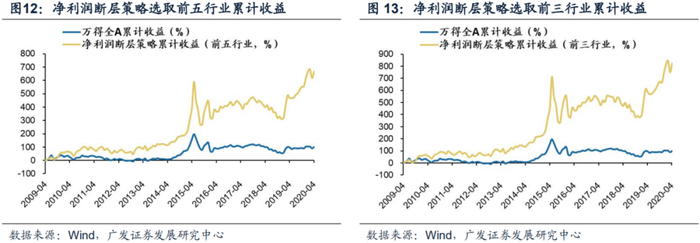 净利润断层选股策略能明显跑赢市场。采用一种较保守的方法构建组合,自2009年5月至2020年4月年复合收益率为20%,超过同期万得全A的6.5%的收益率水平。我们从多方面测试了净利润断层选股策略的稳健性。行业层面上分别回测了每个季度净利润断层股票相对数量占比的前三个和前五个行业;权重方面对各行业采取等权重配置,各行业内部再对本行业净利润断层个股进行等权重配置;再平衡方面,仅在每次更换行业时对持仓进行调整,在其余时间进行均不对持仓进行调整,即每年只进行三次大的调整。同时我们考虑了交易成本的影响,交易成本按千分之三计算。总体来看,净利润断层策略能够取得明显的超额收益。以2009年4月30日为基期,选取前五个行业,2009年4月30日至2020年4月30日累计收益率达到了666%,年化复合收益率20.33%;选取前三行业,同期累计收益率824%,年化复合收益率22.40%。作为对比,同期万得全A累计收益率99%,年化复合收益率6.46%。可以看出,无论是采取前五个行业还是前三个行业,净利润断层选股策略组合能带来明显的超额收益。