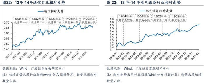 13年到14年期间,通过净利润断层个股相对数量占比靠前可筛选出通信、电气设备、医药,上述行业均明显跑赢市场平均水平。