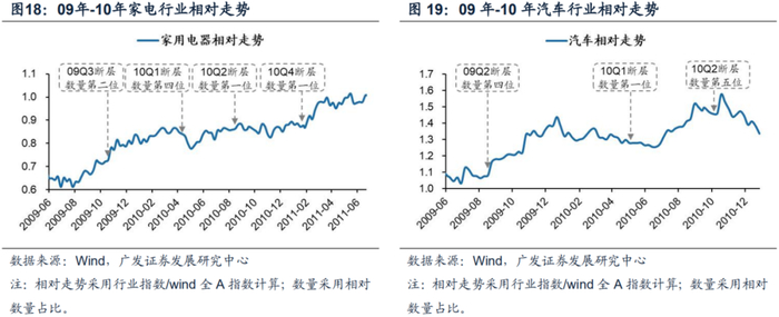 09年到10年期间,通过净利润断层个股相对数量占比靠前可筛选出采掘、建材、家电、汽车、电子,上述行业均明显跑赢市场平均水平。