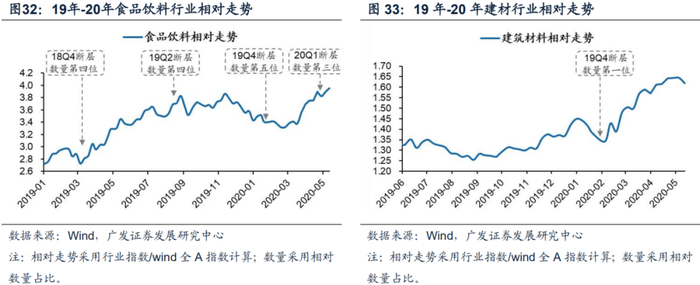 建筑材料在19Q4财报季净利润断层个股相对数量占比位居第一位,从20年1月31日到20年5月19日,食品饮料超额收益为18%;