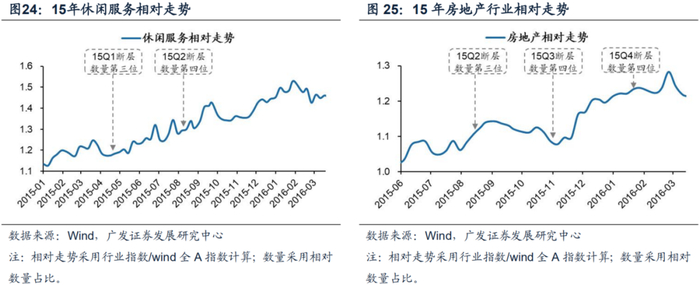 在15年通过净利润断层个股相对数量占比靠前可筛选出休闲服务和房地产,均明显跑赢市场平均水平。