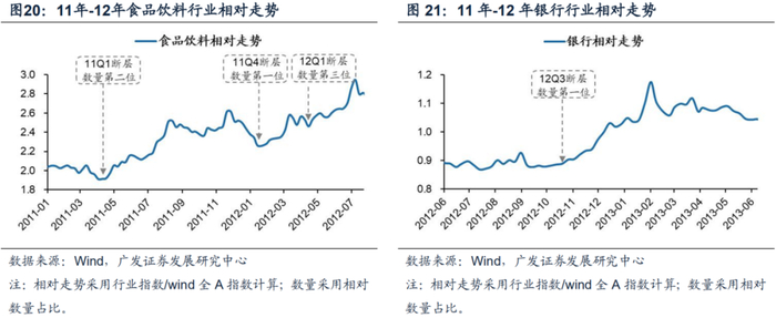 11年到12年期间,通过净利润断层个股相对数量占比靠前可筛选出食品饮料和银行,均明显跑赢市场平均水平。