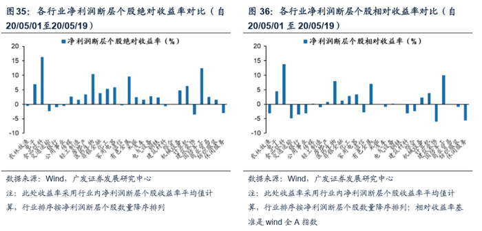 从收益率视角看,20Q1净利润断层个股相对数量占比前三名行业农林牧渔、电子、食品饮料,其中电子和食品饮料行业净利润断层个股收益率平均来看在今年5月初以来均取得绝对收益和相对收益。20Q1财报季净利润断层个股相对数量占比靠前的行业是农林牧渔、电子、食品饮料等。自20Q1财报季公布完毕后,从5月1日至5月19日,除农林牧渔外前三个行业的净利润断层个股收益率平均值,无论是绝对收益维度还是相对收益维度均为正,前三行业中仅农林牧渔取得负收益。另外,净利润断层个股相对数量占比居前的食品饮料行业成为收益率最高的行业,说明依靠净利润断层策略更容易筛选出业绩增长势头较好的行业。