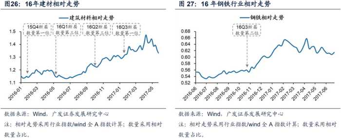 在16年通过净利润断层个股相对数量占比靠前可筛选出建材和钢铁,均明显跑赢市场平均水平。