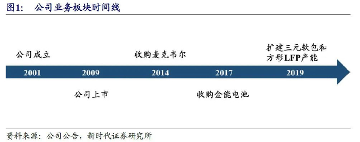 公司的主业为锂原电池和锂离子电池的生产和销售。公司总部位于广东惠州,成立于2001年,以锂原电池业务起家,于2009年上市,于2014年收购麦克韦尔51%股权进入电子烟领域,于2017年收购金能电池拓展消费领域,于2019年扩建软包三元和方形LFP,拓展动力和储能领域。