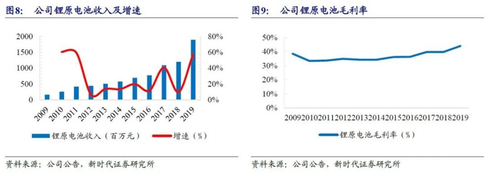 公司是锂原电池龙头,近10年复合增速为28%,近年来毛利率持续提升,2019年为44%。