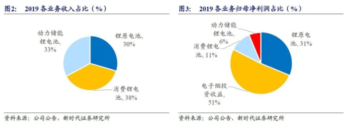 公司目前利基业务主要是锂原电池和电子烟,预计未来锂离子电池业绩贡献占比将扩大。2019年从收入来看,锂原电池、消费锂电池、动力锂电池收入占比分别为30%、38%、33%,从归母净利润来看,锂原电池、电子烟投资收益、消费锂电池、动力锂电池占比分别为31%、51%、11%、6%。