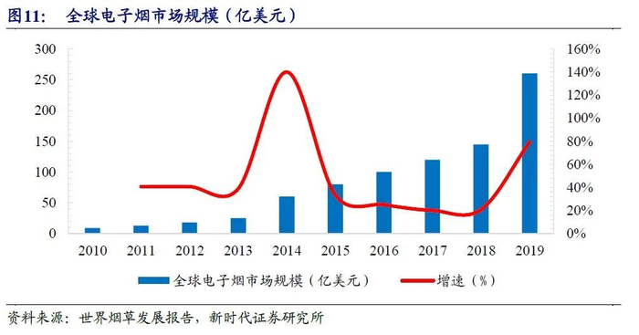 电子烟是一种新型烟草,近年来市场规模在快速增长,2019年市场规模约260亿美元,渗透率3%。