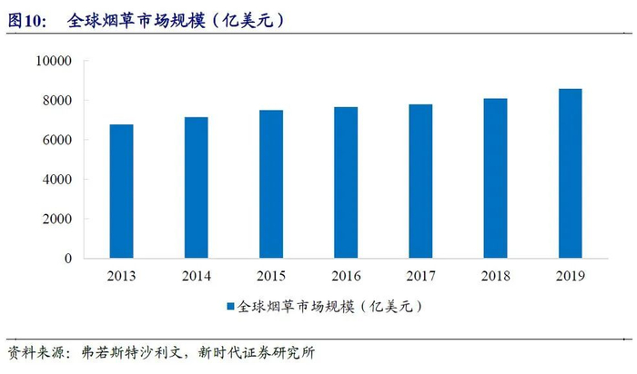 吸烟是一种成瘾性消费,全球烟民和烟草市场规模一直比较稳定,全球烟民数量大致在13亿人,2019年烟草市场规模大致在8593亿美元。