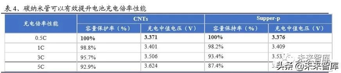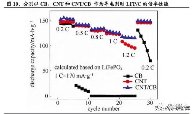 循环性能方面,CNT 所形成的导电网络不会在电池充放电过程中因为电极材料的 膨胀与收缩而破裂,避免了锂电池在充放电过程中因为导电网络破坏而引起的容 量下降,因此 CNT 导电剂可进一步提升锂电池的循环寿命。