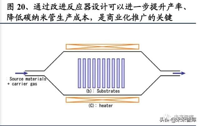 (2) CVD 碳纳米管生长:将催化剂放入碳纳米管反应器,再 将甲烷或丙烯(碳 氢化合物) 、氢气(抑制径向生长)、氮气等按一定比例、气流速度导入, 在高温条件下生长得到碳纳米管粗粉。其中 CVD 碳纳米管连续生产工艺 以及相关设备均是核心技术难点,各厂家均建立了相对应设备专利体系。