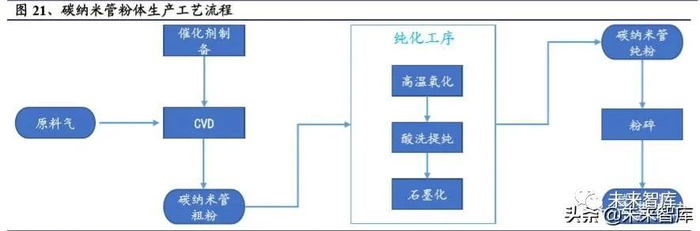 碳纳米管的制备方法大体上分为两个阶段:包括碳纳米管初生长和进一步纯化; 核心工艺为催化剂条件下的化学气相沉积(CVD, Chemical Vapor Deposition)碳 纳米管粉体的主要生产工艺流程如下: