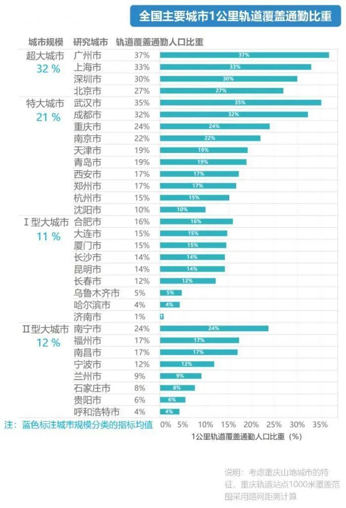 36个城市中,1公里轨道覆盖通勤比重最高的城市是广州,达到了37%,其次为武汉为35%,上海为33%,成都为32%,比例最低的济南仅有1%。