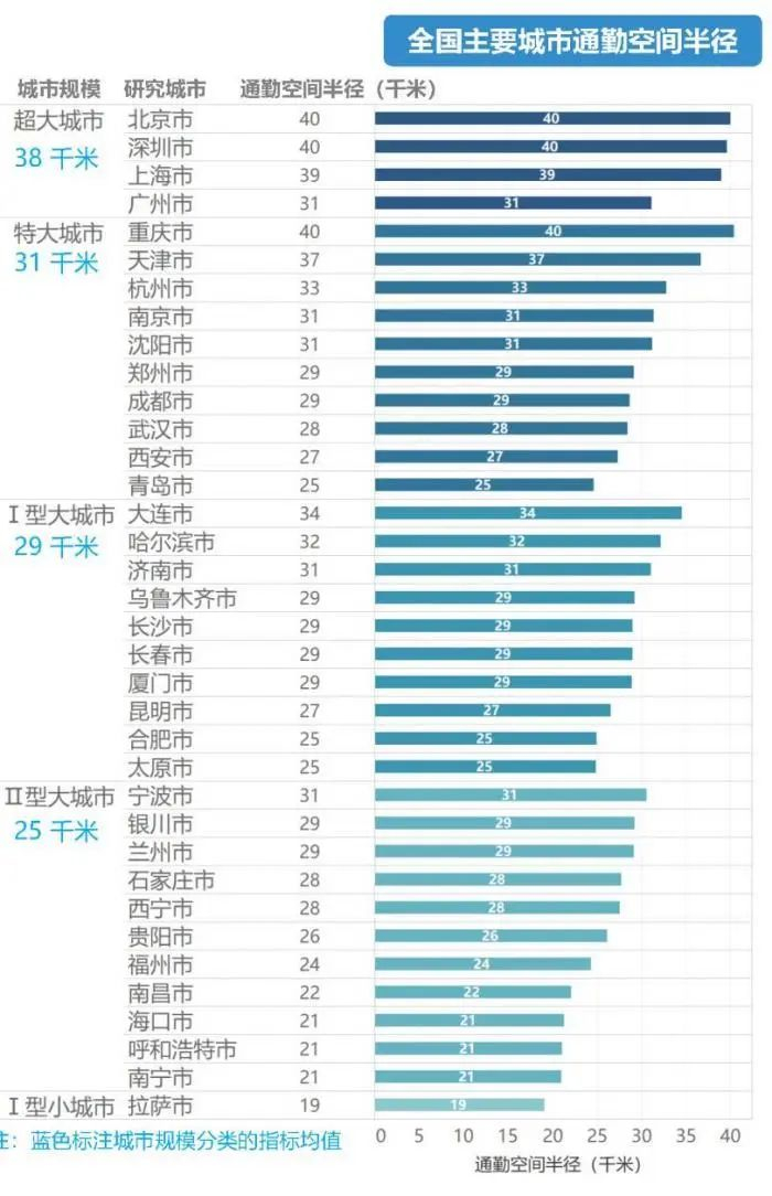 报告数据显示,北京、深圳、重庆的通勤空间半径均为40千米,上海为39千米,其次为天津37千米,广州则为31千米。