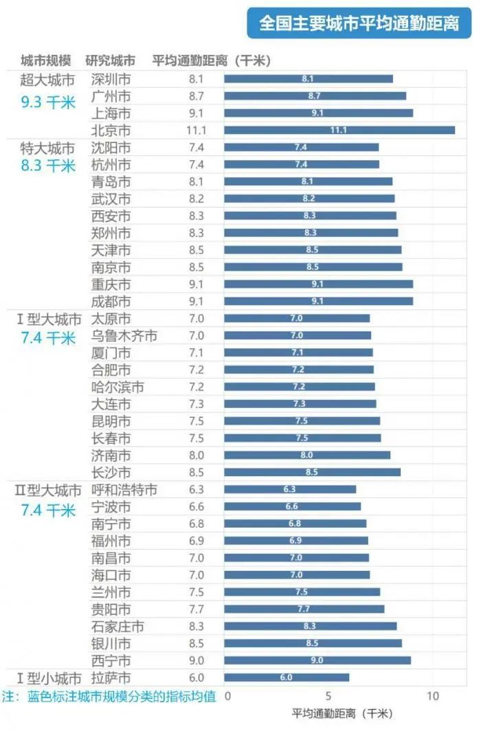 通勤距离是指家到就业地的距离。平均通勤距离越大,意味着居民通勤成本越高,城市需要更高效的交通系统支撑。