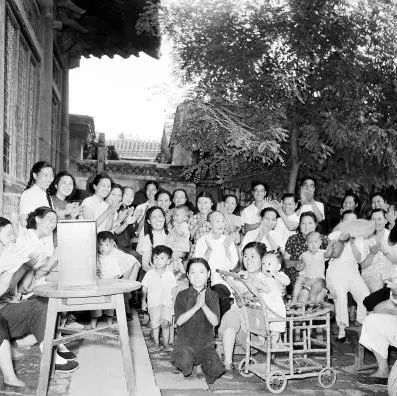1954年,北京市第一届人民代表大会第一次会议召开期间,东单区西观音寺居民从广播中听到毛主席当选为全国人民代表大会代表时,热烈鼓掌欢呼。(摄影:江定保)