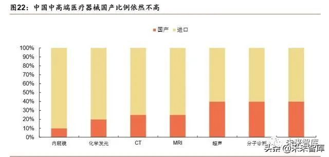 根据前瞻产业研究院的数据,我国医疗器械市场的 25%是高端产品市场,这其中 70% 由外资占领。这 70%的外资企业在医学影像设备和体外诊断等技术壁垒较高的领 域,市场占有率超过 80%,而我国医疗器械企业主要生产中低端品种。