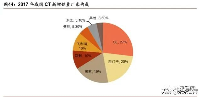 由于近年来国家政策的鼓励,东软、联影、安科等国产企业也开始发力,在新增 CT 设备销量中的占比逐渐提升。