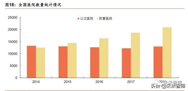 与扶持社会办医政策相配套的是民营医院医用设备配置的放开。卫计委 2018 年 10 月 29 日颁布的《关于发布 2018—2020 年大型医用设备配置规划的通知》指出:不以医疗机构等级、床位规模等业务量因素作为非公立医疗机构的主要配置标准;配置大型医用设备不分所有制、投资主体、隶属关系和经营性质,实行统一规划、 准入、监管。随着社会办医阵营的持续发展,目前无论是医疗机构家数还是床位数 量,都已超过公立体系,成为医疗器械的另外一个大市场。