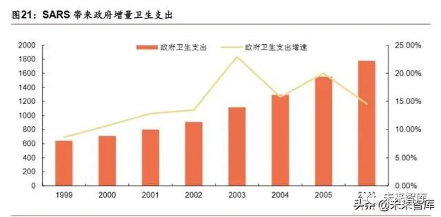 SARS 带来的增量财政投入带来了大量采购机会。以 2003 年 SARS 为例,2003 年的非典使得有关部门对公共卫生体系建设的重视程度进一步提高,政府医疗卫生 投入和政府医疗保障支持大幅增加。2003~2006 年国家政府卫生支出增幅同比分别 是 22.9%、15.8%、20%、14.6%。随后的几年间,我国医疗器械行业市场规模复 合增速长期保持在 20%以上