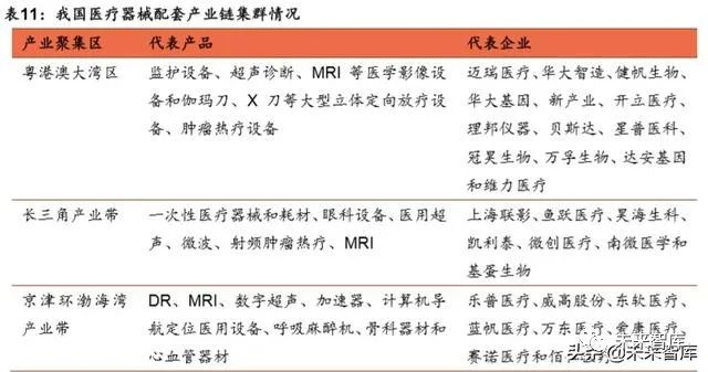 此外,在配套产业链方面,我国已经形成多个专业化产业集群,为控制成本、扩大 生产规模创造了条件。粤港澳大湾区、长三角及京津环渤海湾三大区域成为本土三 大医疗器械产业聚集区,且三大产业聚集区又各具特色: