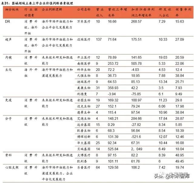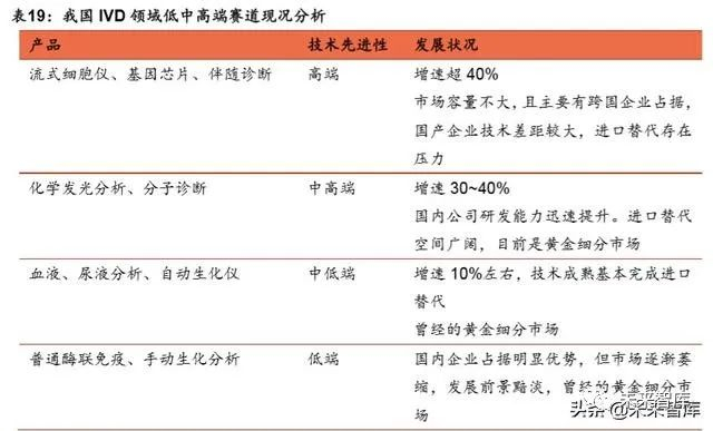 对于技术壁垒高的领域,国内企业技术跟进程度一般较低,比如关节类骨科耗材;化学发光、分子诊断、伴随诊断等 IVD 细分领域;MRI、内窥镜等大型影像设备。这类赛道由于技术壁垒高,在行业消费升级的大趋势下,国内配置普及率普遍仍 有较大提升空间,目前多数处于行业高增长的态势。这一赛道的国内企业多通过 在产业链某一环节的技术切入,基于性价比和渠道优势,在基层机构市场内进行 争夺,企业中长期的价值判断逻辑则需要基于未来技术研发和跟进能力。