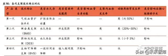 又比如心脏支架,作为技术含量高、典型的创新驱动型产品,需要不停地更新换 代。第一代,单纯球囊扩张技术:发明于 1977 年,1980 年后期开始在临床广泛 应用,缺点是扩张后容易回缩,术后狭窄率高。第二代,金属裸支架:1993 年诞 生后解决了单纯球囊扩张后“回缩”的问题,迅速成为主流,1998 年 75%的 PCI 会 在球囊扩张后植入支架,目前这一比例提升至 85%以上,但是术后狭窄率仍然较 高。第三代,药物涂层支架:即在支架表面涂上紫杉醇、西罗莫司等抑制增生药 物,跟金属裸支架比,可以显著降低术后再狭窄率,2002 年上市后迅速替代上一 代金支架,目前70%以上的冠脉支架为药物涂层支架,国内这一比例接近100%。第四代,可吸收支架:部分解决了支架术后再狭窄难以干预的问题,最早由雅培 研发的 Absorb 于 2012 年底在欧洲上市,截止 2014 年,全球植入 Absorb 患者 超过 2.5 万人。