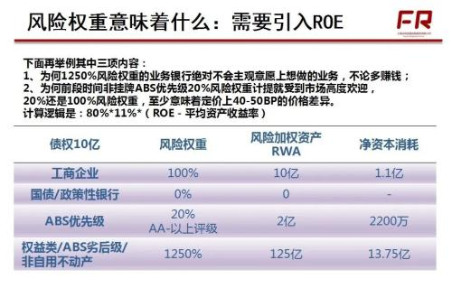 按照1250%的权重计提的资产有很多,这里列举了其中的三类——权益类、ABS劣后级、非自用不动产。由于较高的计提权重,从股东角度来讲也并不划算。
