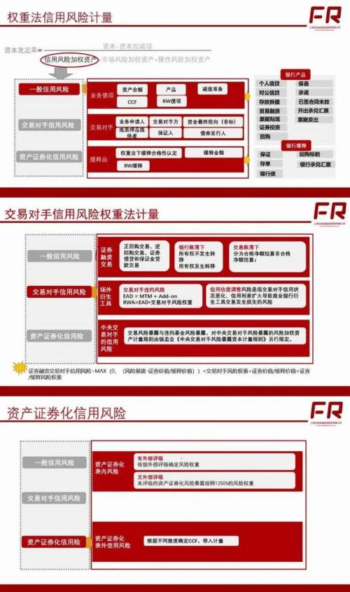 举个例子,信用风险在风险资产中占比较大,在信用风险方面,最新版巴Ⅲ中,银行风险暴露权重整体有所提升,当金融质押品缓释力下降或者表外的贷款承诺转化系数上升,会直接导致风险资产增加,那么资本充足率就会下降。