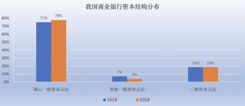 2019年,我国商业银行核心一级资本、其他一级资本、二级资本占比分别为75%、7%、18%。根据《巴塞尔协议Ⅲ》中资本结构最优情况是71.4%、9.5%、19.1%。