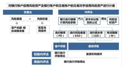 权重法相对简单,对于每一类风险资产,都由监管机构告诉我们其风险权重是多少,然后来计算风险加权资产。内评法分为初级内评法和高级内评法,目前国内还是以初级内评法为主。