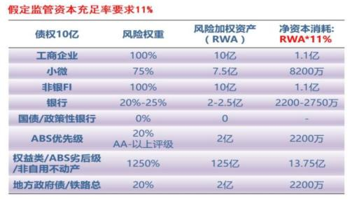 假设资本充足率要求为11%(系统重要性银行是11.5%,非系统重要性银行是10.5%,平均一下就是11%,并且笔者认为对于多数银行来说其资本充足率的底线为11%),风险加权资产10亿元乘以资本充足率11%得到净资本消耗1.1亿元。