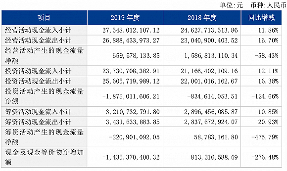 2019年德邦经营活动产生的现金流量净额减少9.27亿元,降幅为 58.43%;投资活动产生的现金流量净额减少10.40亿元,同比下降124.66%;筹资活动产生的现金流量净额减少2.80亿元,降幅为475.79 %。原因主要包括德邦期间加大对运力、人力等资源投入,加大车辆、分拣设备等资本性投入等方面。