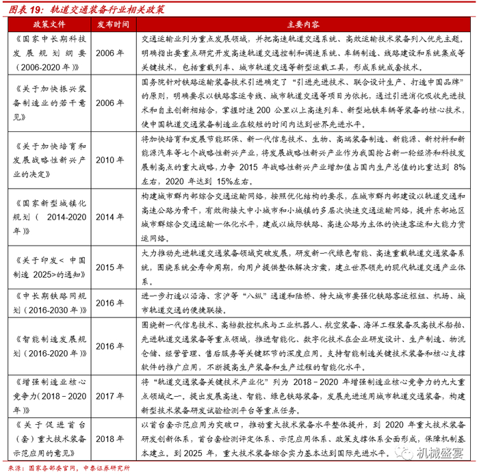 信号系统是轨道交通核心设备,政策支持力度大。轨道交通装备行业是国家一直大力支持的战略新兴产业,在《中国制造2025》、《增强制造业核心竞争力》、《“十三五”国家战略性新兴产业发展规划》等文件中,均强调要重点发展城市轨道交通装备等先进制造业。信号系统作为轨道交通的核心设备,亦是国家重点支持国产化的设备之一。此外,在《“十三五”现代综合交通运输体系发展规划》的“提升交通发展智能化水平”中明确提出对城市轨道交通信号系统行业技术发展的要求,即“推广应用城市轨道交通自主化全自动运行系统、基于无线通信的列车控制系统等,促进不同线路和设备之间相互联通”。
