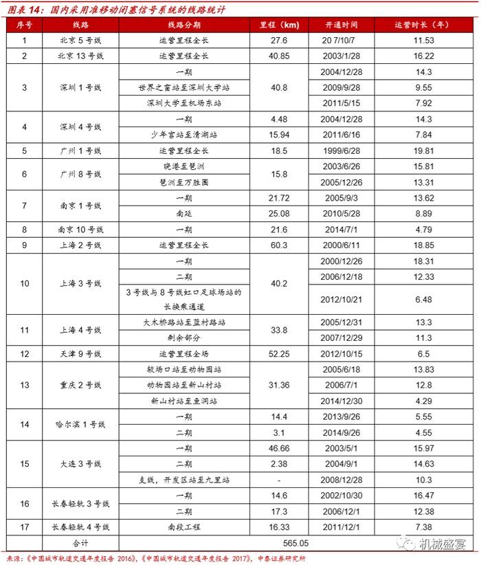 1)根据《中国城市轨道交通发展报告》,截至2018年年底,国内采用准移动闭塞线路合计565.05公里,平均运营时长11.71年,采用CBTC系统方案对既有线路进行升级的价格约为 1400-1800万元/公里,以中位值造价计算,则当前既有线路升级改造市场的市场空间为90.41亿元。