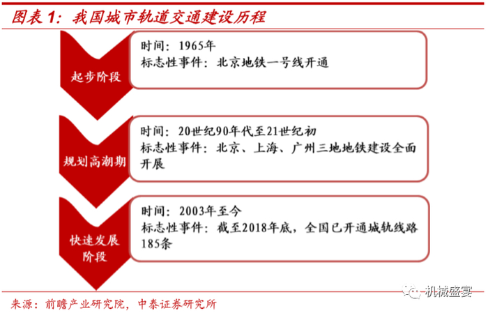 ①我国城轨行业具备起步晚、高起点、发展快的特征。我国于1965年在北京建成第一条地铁线路;20世纪末,我国城轨进入有序高速发展阶段。